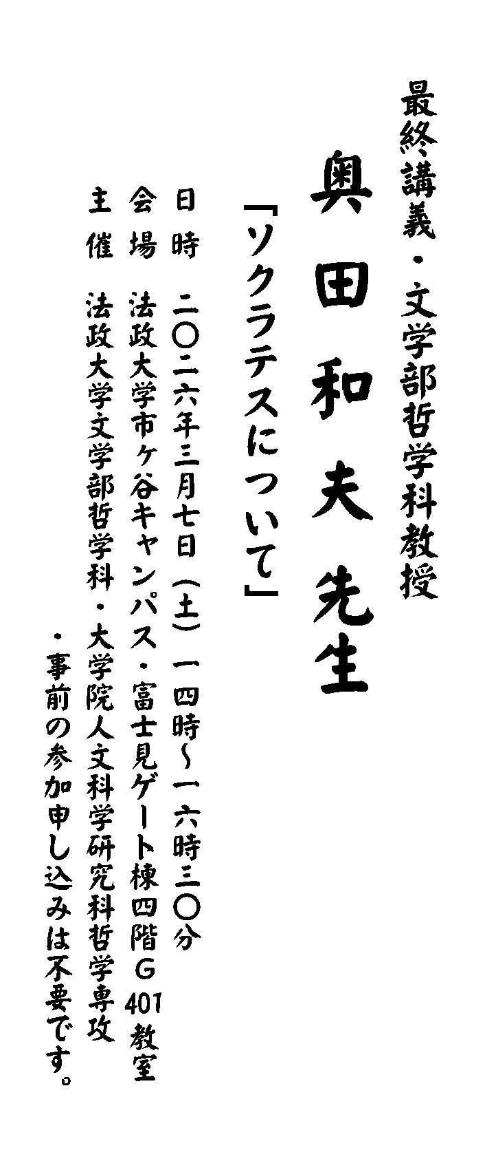 【2025年度・最終講義】奥田 和夫 教授(2026年3月7日)〔看板〕